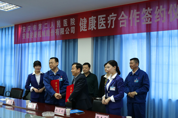安慶市衛(wèi)計(jì)委施勤副主任、安慶市經(jīng)開區(qū)管委會社會事業(yè)發(fā)展局局長周健康,公司董事長黃樂明、工會主席殷春華和市二院黨委書記、院長趙家彬等出席簽約儀式。